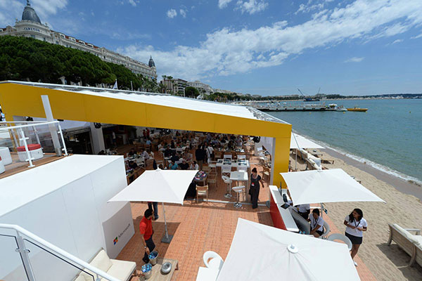With only 6 days to erect the building in Cannes and 3 trucks delivering the staging it took a 17 man strong workforce to complete the build. There were several onsite issues including negotiating the steps to the beachfront with large structural beams and avoiding the rain but by opening day Microsoft had a beachfront presence not to be forgotten.